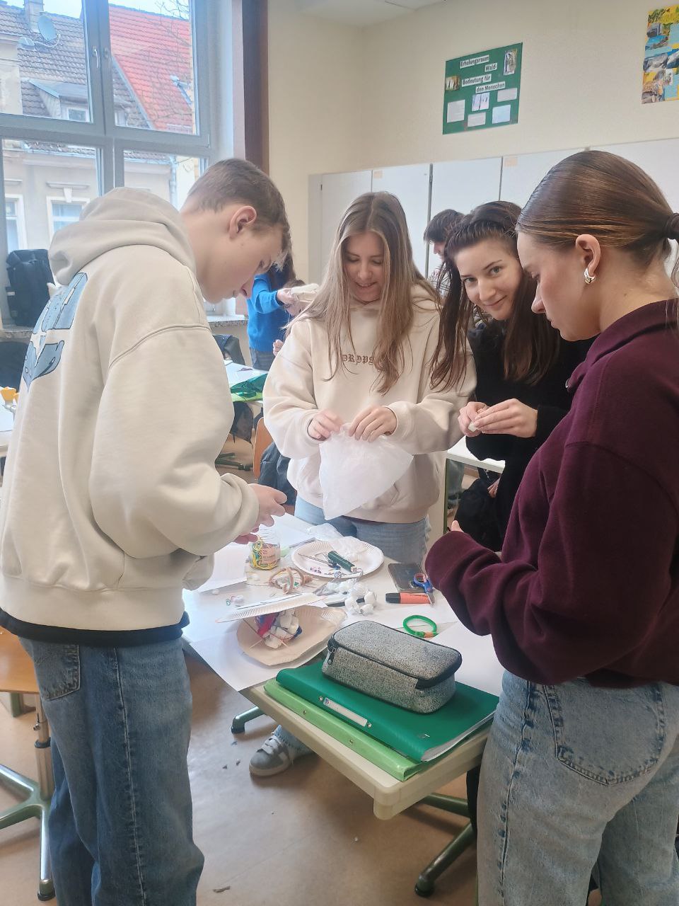 Gruppen aus jeweils 4 Personen fanden sich zusammen und gestalteten nachhaltige, kreative und natürlich sichere Konstruktionen, damit die Eier wohlbehalten auf dem Schulhof ankommen würden.